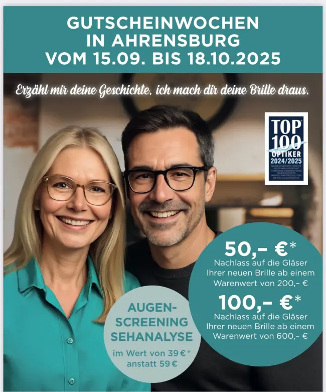Zu unserem Service als Optiker in Ahrensburg gehört die Anfertigung Ihrer individuellen Brille in unserer eigenen Werkstatt, für spontane auch im 24 Stundenservice. Sehschärfenmessung, Augeninnendruck Screening und Feststellung mit neuester Technik bieten wir ihnen gerne nach Terminabsprache.